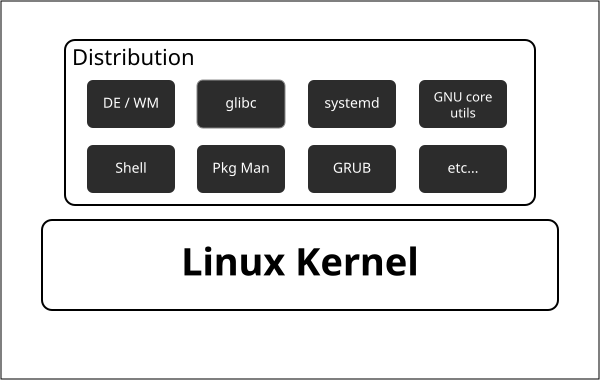 先程Linux kernelと関連ソフトウェアの総称と述べたようにLinux単体はKernelを示す場合が多く、Kernelだけでは通常使用するのが難しいです。焚き火しか用意されていないようなものです。