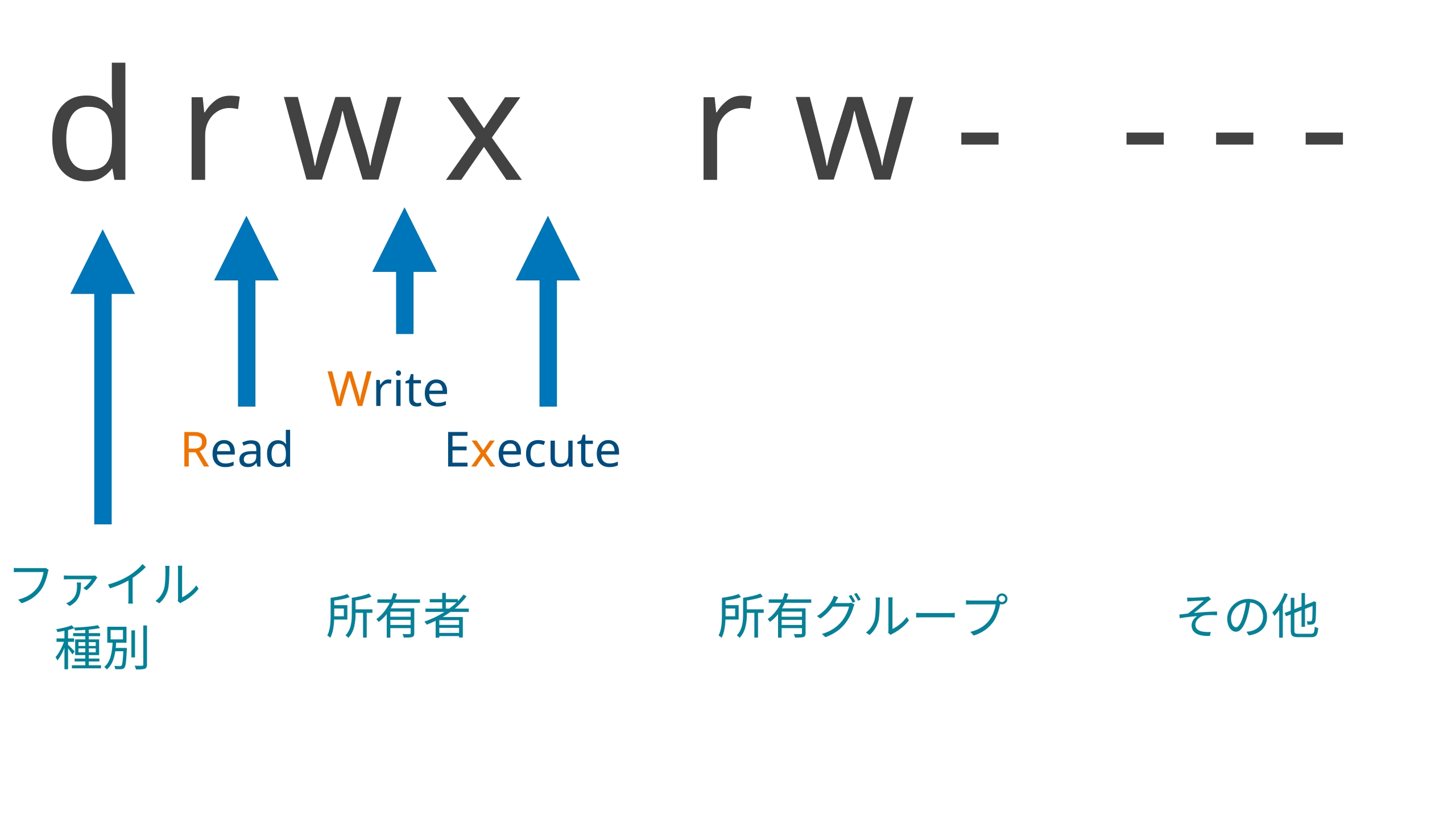 Linuxではファイルに対してRead(読み込み), Write(書き込み), Execute(実行),の3種類の権限が存在し、Owner(所有者), Group(グループ), Other(その他)の3種類のユーザー(user class)に対してそれぞれ設定します。
